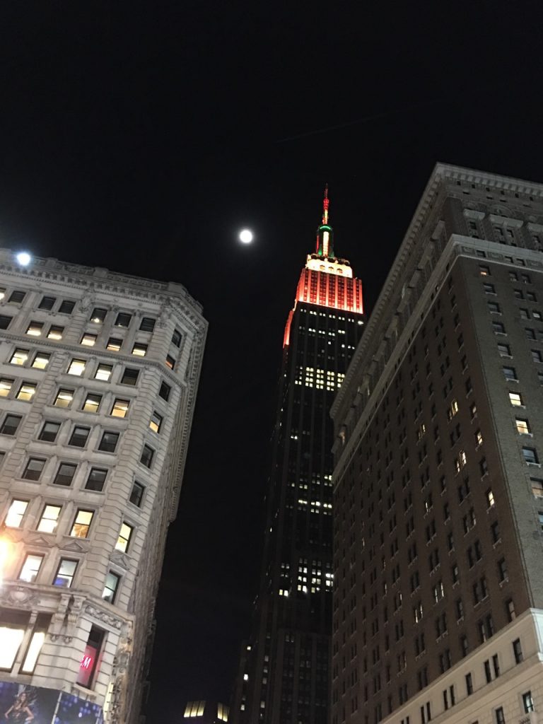 The Empire State Building can be lit up in many different colors. It can be a sponsored event that lights them up or a holiday like today. Today is Thanksgiving Day so you can see fall colors on the building! Thanksgiving evening has become the beginning of Black Friday. With unusually warm weather, we decided to go for a walk near Macy’s just to peek at how people were attacking the sales. When I looked up at the sky, I noticed that it was also a full moon! Isn’t the Empire State extra pretty tonight?