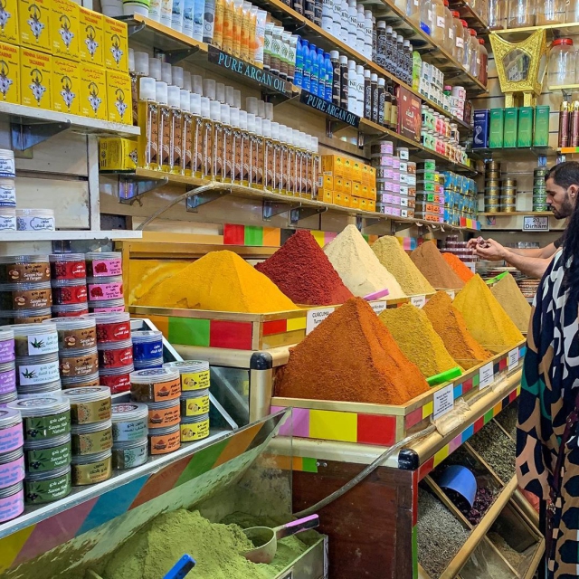 ヤッホー!モロッコのマラケシュに来てます!モロッコと言えばやっぱりスークでお買い物でしょ。ジャマ・エル・フナ広場を通って迷路のようなスークに入りました。ここはスパイスのスークで私の目当てはラスエルハヌートのスパイスブレンド。このスパイスを使うとなんでもモロッカンな味に早変わり〜。美味しいよ!ついでに黒い石鹸(オリーブで出来てる)やアルガンオイルも買いました〜