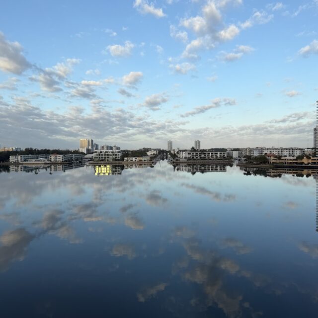 これは私の部屋の窓からの景色。ビスケーン湾、そして全米の海岸沿いをつなぐイントラコースタル・ウォーターウェイの一部。普段は高級ボートがひっきりなしに行き交っているけれど、風のない朝はこんなふうに水面が鏡みたいに静かになったりするのよね。時々イルカが通ったり遊んでたりすることもあって、そんな日はちょっとラッキーな気分。最近はいろいろと落ち着かないことも多いけれど、こういう穏やかな景色で一日を始められることに、ふと感謝したくなる。