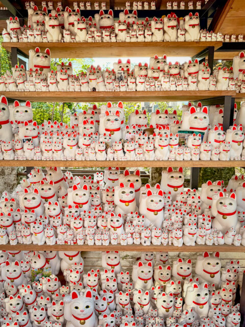 I’ve been meaning to visit the lucky cats at Gōtokuji Temple for the longest time, but this one happened through pure serendipity—which feels only fitting. I found myself in a neighborhood I rarely visit, running a quick errand, and on a whim checked Google Maps to see where I was. Turns out, I was just eight minutes away from the cats. In peak sakura season, no less. The walk there was lined with blooming cherry blossom trees, and when I arrived, some of the cats seemed to be huddled among fallen pink petals—like they had been waiting for this exact moment.